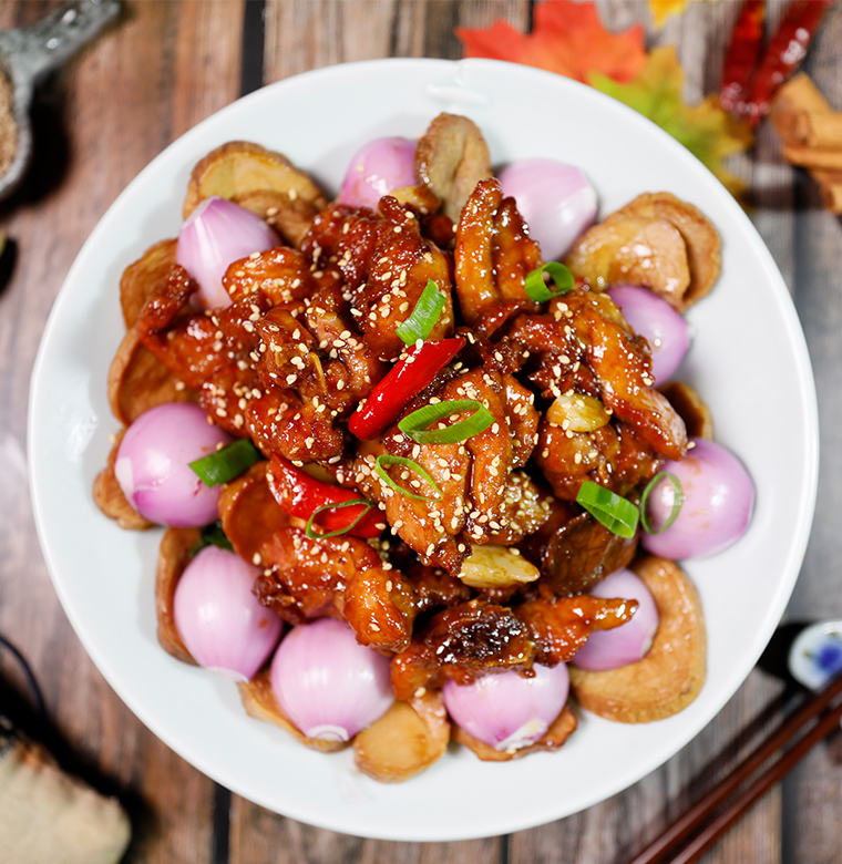 三黃雞、油炸杏鮑菇、大蒜頭、姜片、洋蔥、九層塔、黑芝麻有、米酒、醬油